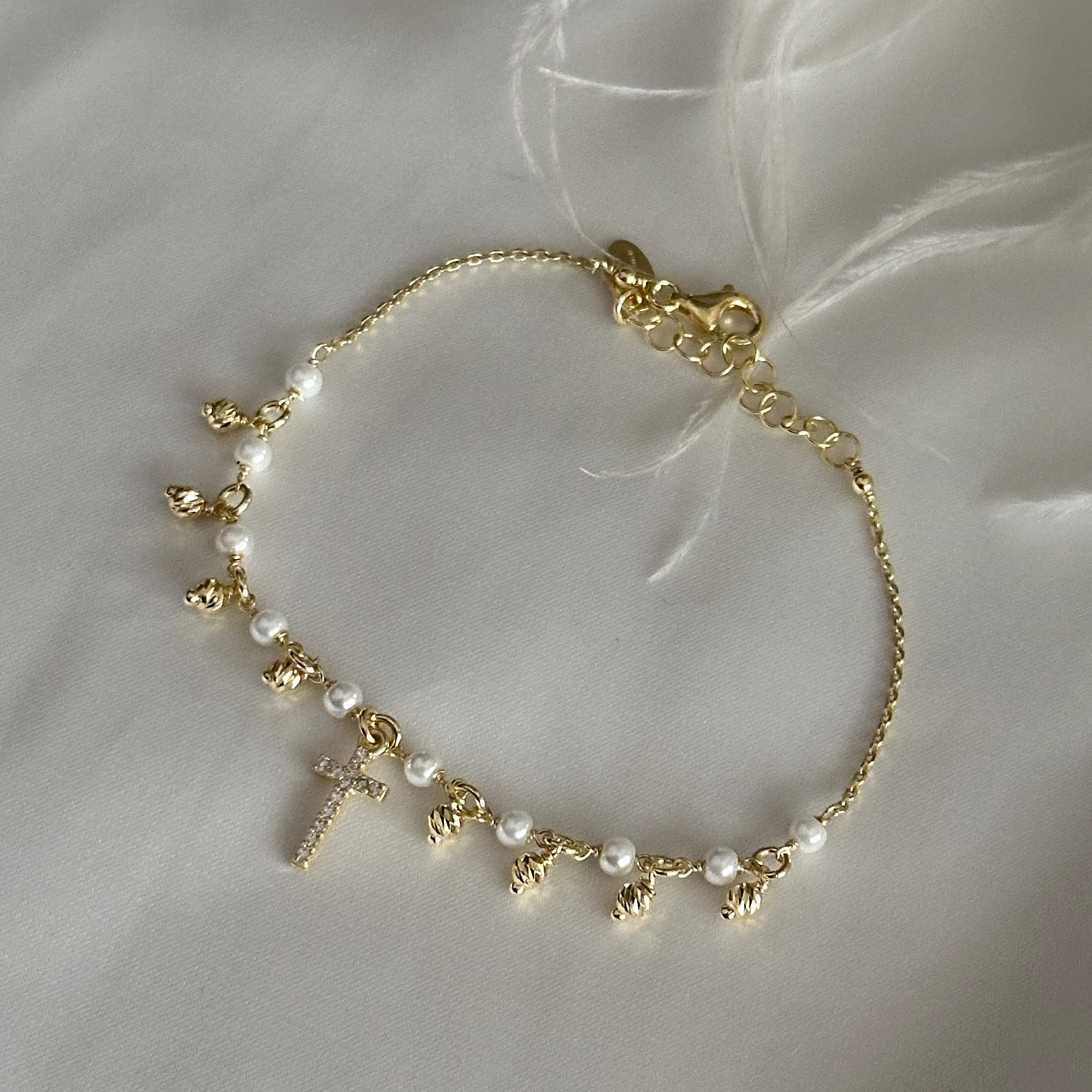 Narukvica od srebra sa pozlatom, krstić od cirkona, biseri i nežni detalji