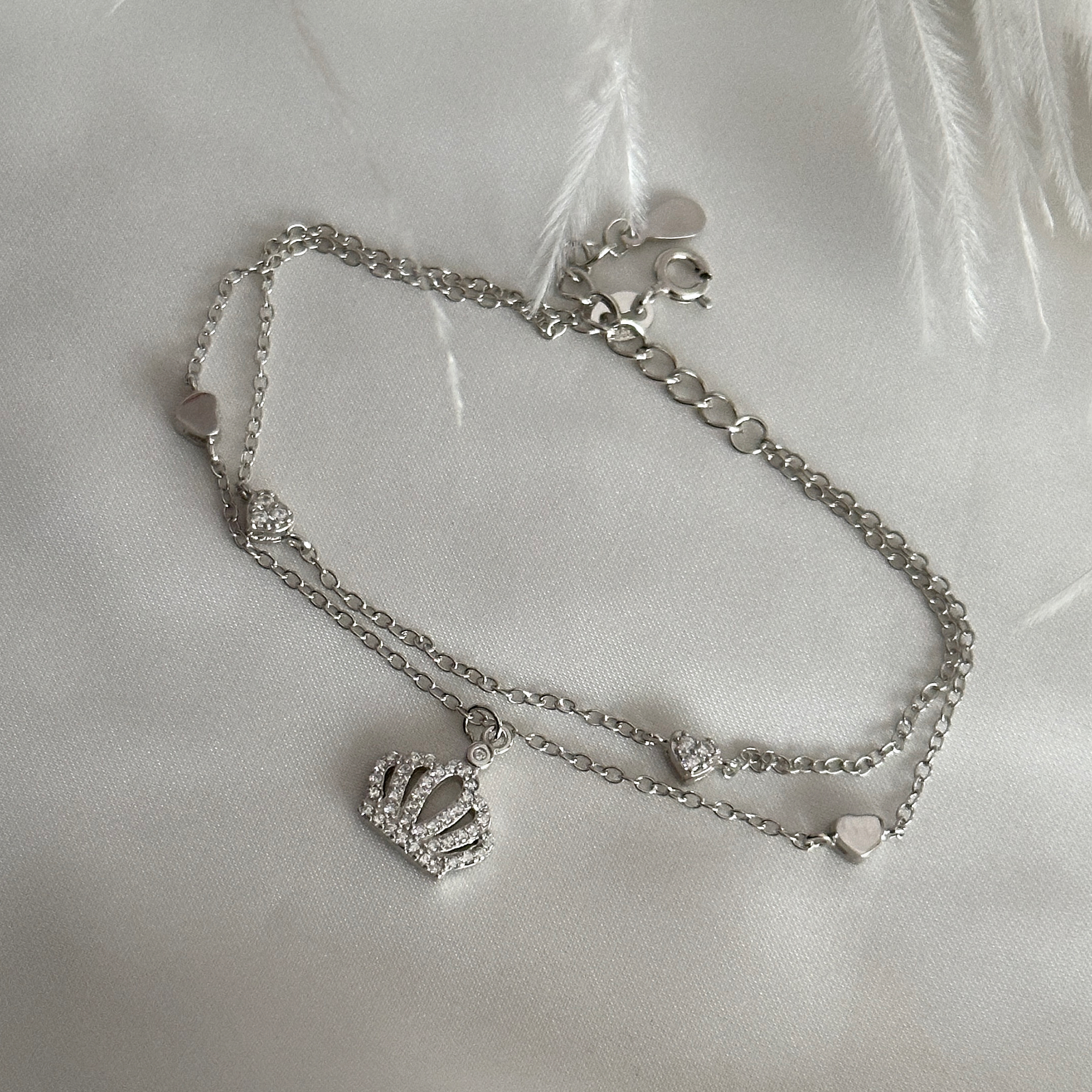 Kruna sa srcima, dvostruka srebrna narukvica sa cirkonima
