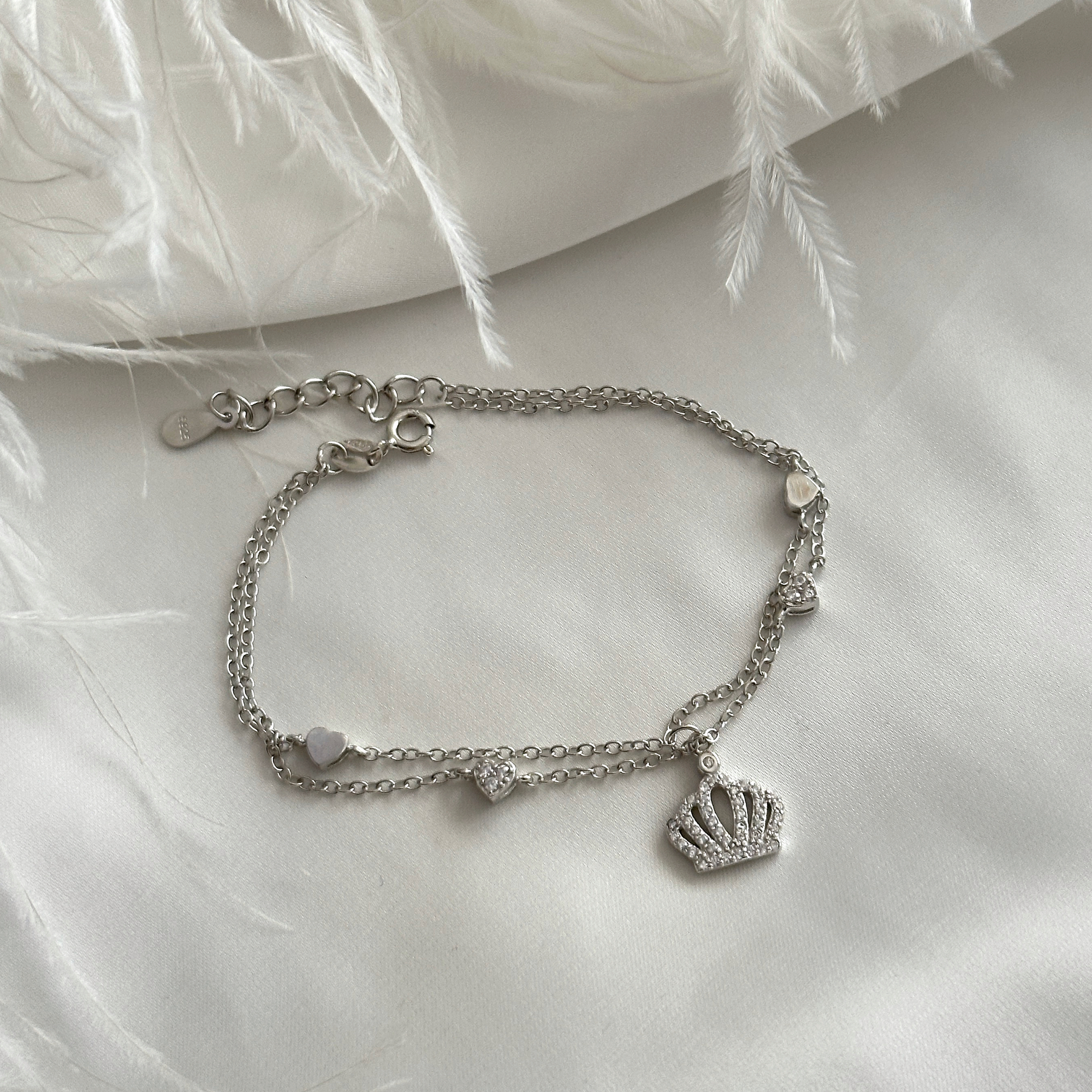 Dupla srebrna narukvica sa krunom i srcima, sa cirkonima