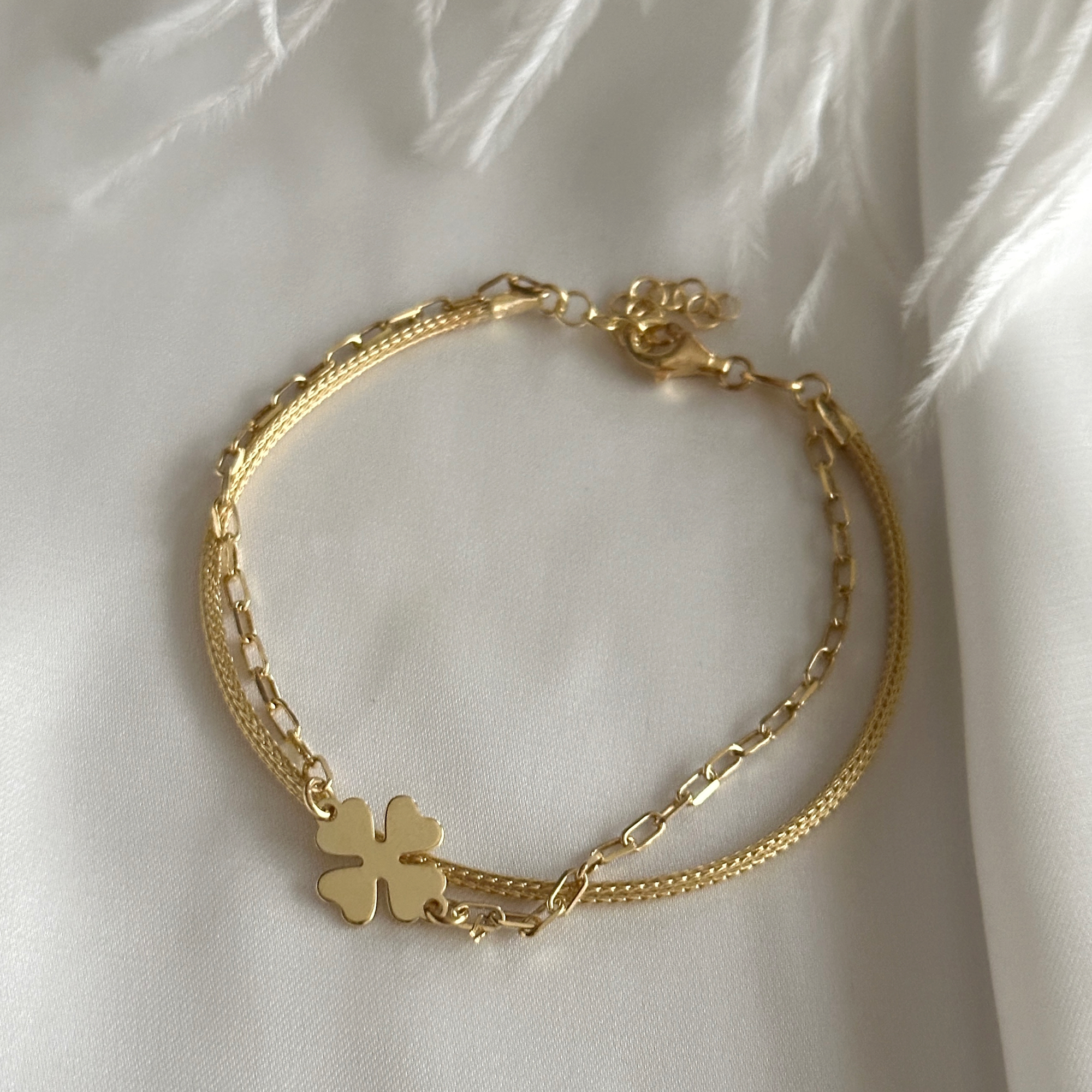 Dvostruka srebrna narukvica sa detelinom i pozlatom